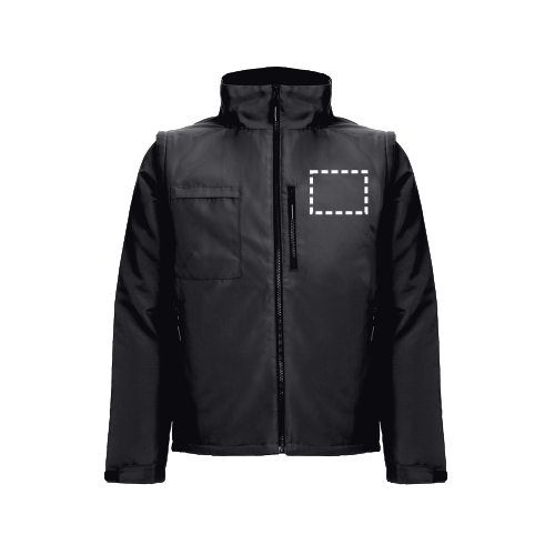 Arbeitsjacke aus 100% Polyester, unisex und gepolstert - Außenseite aus 100% Oxford Polyester mit Acrylbeschichtung (170g/m²), Füllung aus 100% Polyester (75g/m²) und Innenseite aus 100% Polyester-Taft (65g/m²). Diese kann durch abnehmbare Ärmel mittels Reißverschluss in eine Weste umgewandelt werden. Gefütterter Kragen mit Polar Mesh. 3 Reißverschlusstaschen. Der Reißverschlusszugang auf der Rückseite vereinfacht die Veredelung. Größen: S, M, L, XL, XXL, 3XL